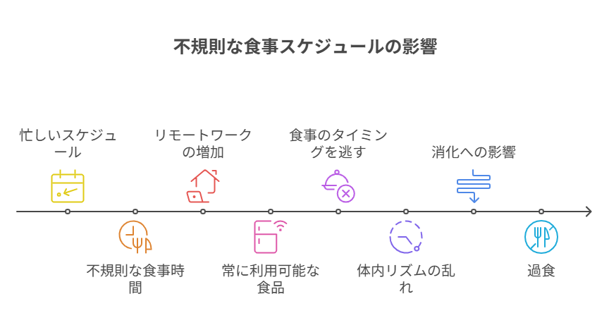 特にリモートワークが増えた近年では、「いつでも食べられる環境」になった反面、逆に食事のタイミングを逃してしまう人も増えています。